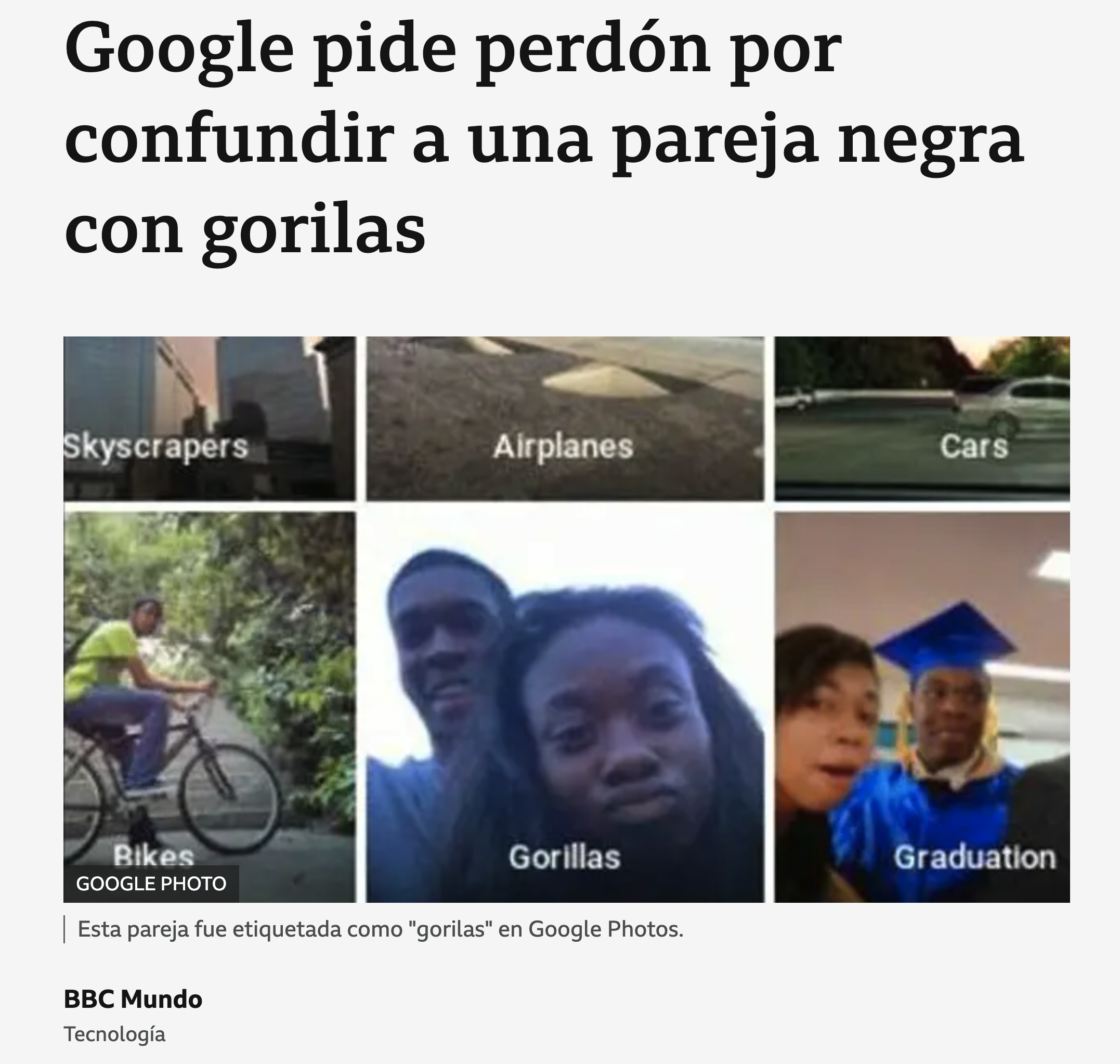 En 2015, el sistema de reconocimiento de imágenes de Google Photos etiquetó a dos personas negras como gorilas. La respuesta de Google fue quirúrgica en la peor acepción del término: borraron la etiqueta “gorila” del sistema. El algoritmo seguía clasificando igual, pero ahora no podía decirlo en voz alta.