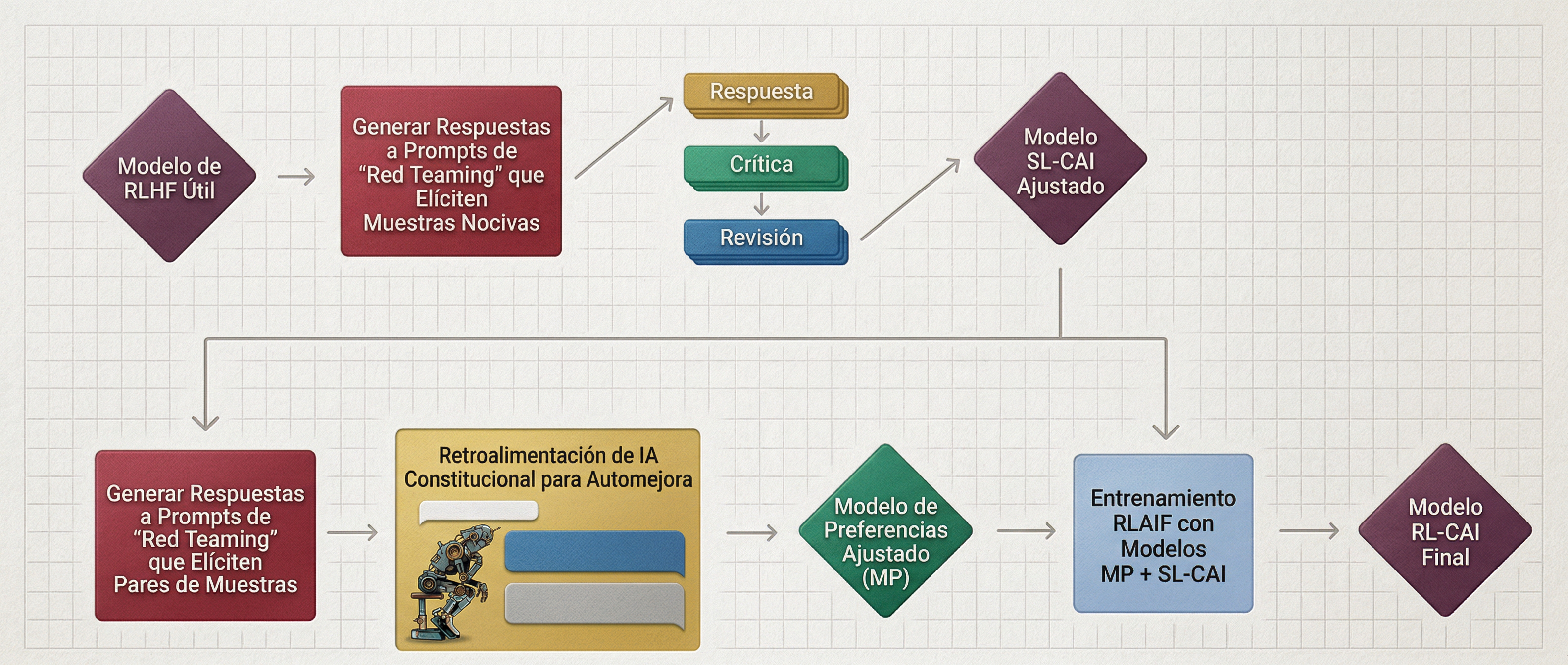 Si el riesgo era existencial, la seguridad tenía que crecer al ritmo de las capacidades. Un sistema artesanal de etiquetado humano no podía seguir ese ritmo. La solución de Anthropic: que el propio modelo se evalúe contra un conjunto de principios escritos (una «constitución») derivados de la Declaración Universal de los Derechos Humanos y otros marcos éticos. RLAIF en vez de RLHF: el feedback venía de otra IA, no de una persona.